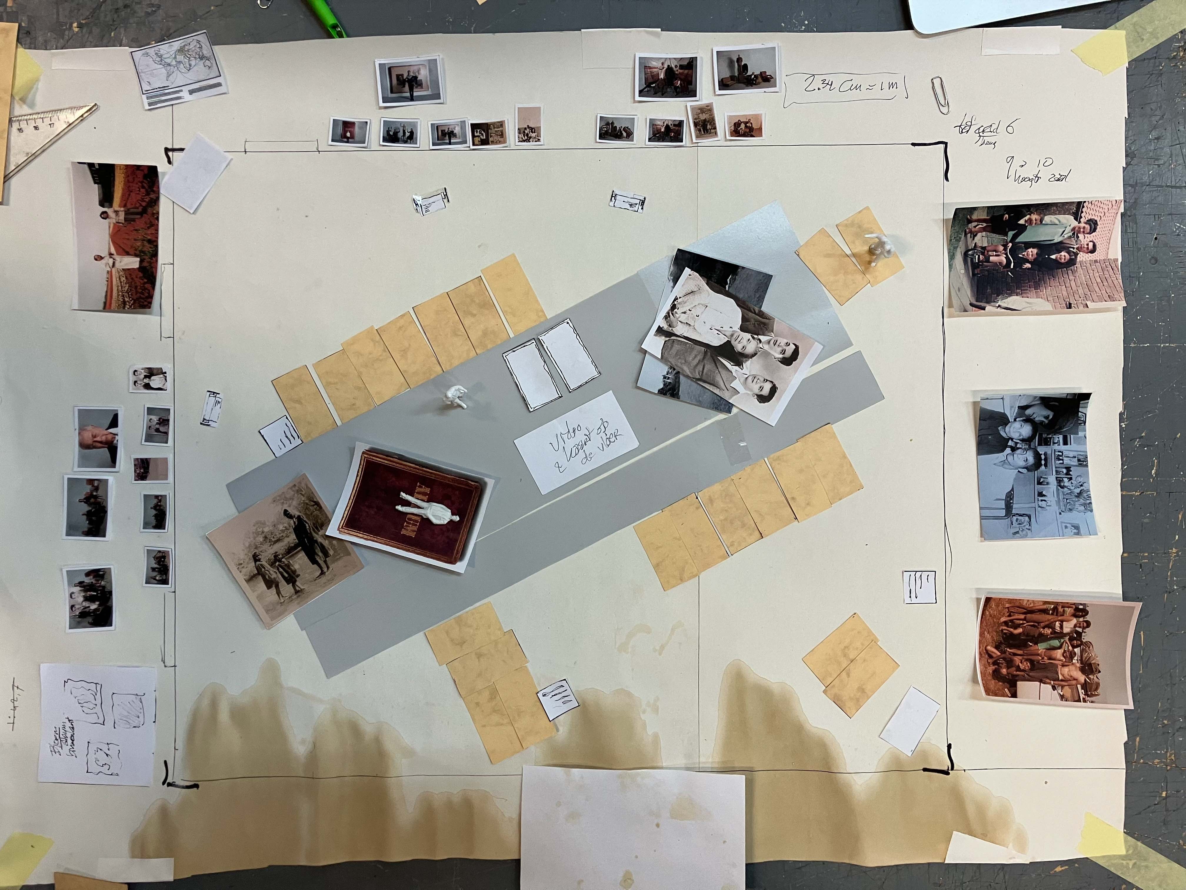 Hier ook een schets van de opstelling voor de afsluiting van donderdag 15 januari 2026 in de Academie voor Theater en Dans. We omringen ons weer met foto’s en decor van Asian Celebration, doen daaruit stukken. We wisselen veel uit. In Asian Celebration keken we naar de familieverhalen van een aantal Aziatische dansers, en zijn de biologische families van deze dansers gefotografeerd door beeldend kunstenaar Michiel Voet.