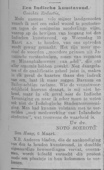 On March 9th, 1916, a letter to the editor was published in De nieuwe courant, protesting some of the terminology that had been used in the advertising posters of a forth coming event at the Stadsschouwburg in Den Haag:
